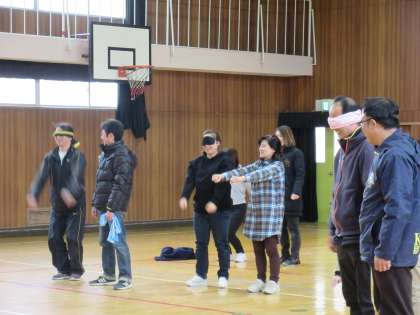 まずお話をお聞ききしました。引き続きアイマスクをつけて準備運動を行いました。