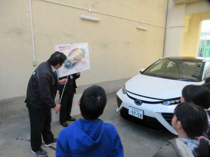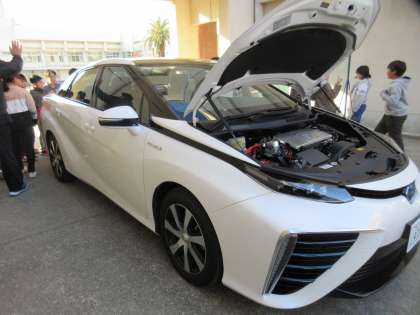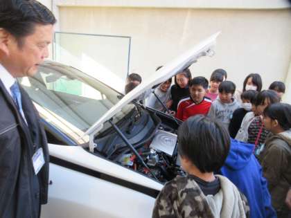 次に、東門でエコカーを見ながら、車(水素自動車)の説明をうかがいました。エンジンのところも見せていただきました。