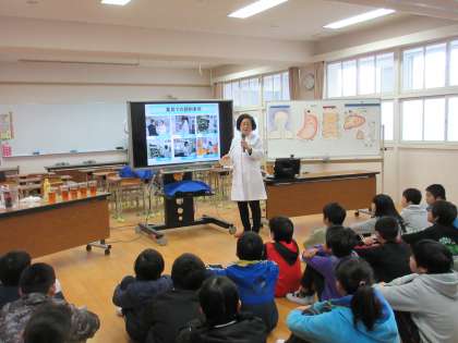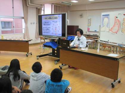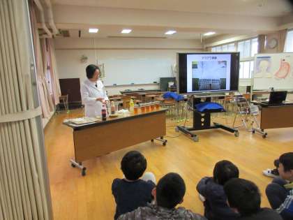学校薬剤師の先生に来ていただき,薬の正しい使い方やたばこの害などについて教えていただきました。簡単な実験も交え,分かりやすく説明していただき,楽しく学習することができました。お家でも薬についてお話してみてはいかがでしょう。