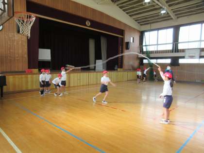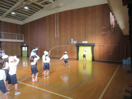 2年生の体育の学習の様子です。講堂でながなわをしています。タイミングを合わせてうまく跳んでいます。