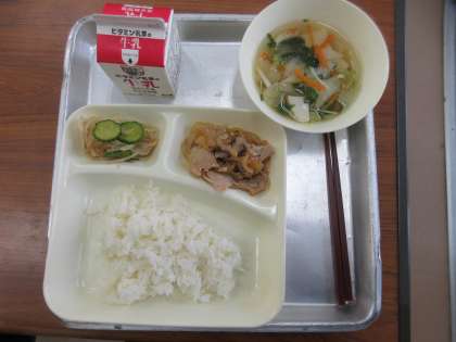 献立:焼き肉、五目汁、きゅうりともやしのおひたし、ごはん、牛乳
