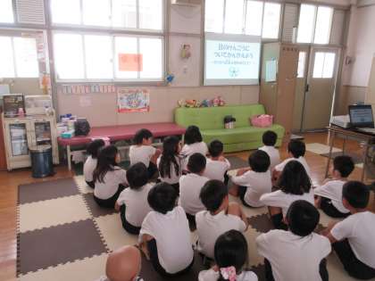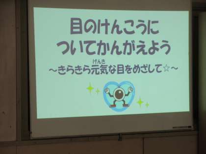 この鵜から体重測定が始まりました。1・2年生は12月に3〜6年生が学校保健委員会で勉強した「目の健康」についてお話を聞きました。