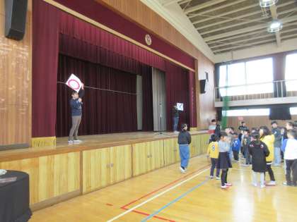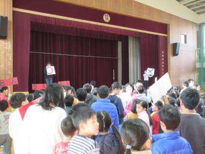 今日は集会委員会が「ゼスチャー〇×ゲーム」を行いました。野球やラグビーなどのゼスチャーをみんなで何かを考えました。