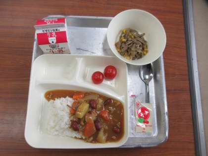 献立:鶏肉と金時豆のカレーライス(ごはん)、ごぼうサラダ、プチトマト、牛乳