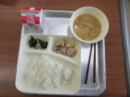 献立:鶏肉のゆず塩焼き、さつまいものみそ汁、こまつなの煮びたし、ごはん、牛乳