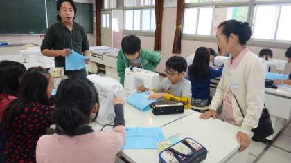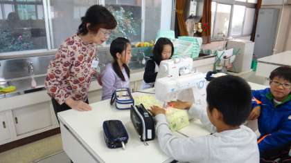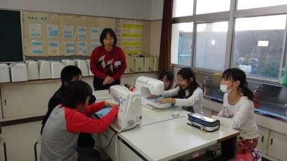 5年生の家庭科、ミシンを使用し学習をしています。地域の学習応援隊の方々に来ていただき、グループに一人ずつミシンの使い方の支援をしていただいています。1クラス、4時間ほど活動していただいています。学習応援隊の方々ありがとうございます。