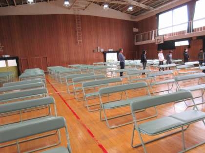 講堂のワックスもきれいに乾き、会場の設営や掲示物の準備を教職員で行いました。