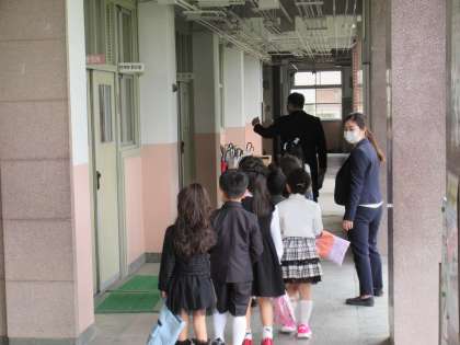 1年生の担任から「学校生活に関して」保護者の皆様にお話をさせていただいている間に新1年生は教室の確認をしたり、学校の中を回ったりしました。