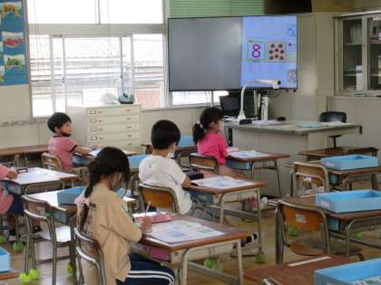 1年生は数字を練習しています。2年生の体育、3年生の国語の学習の様子です。