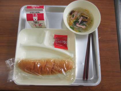 献立:ハムと野菜の中華スープ、パン、いちごジャム、牛乳 「ごちそうさまでした。」