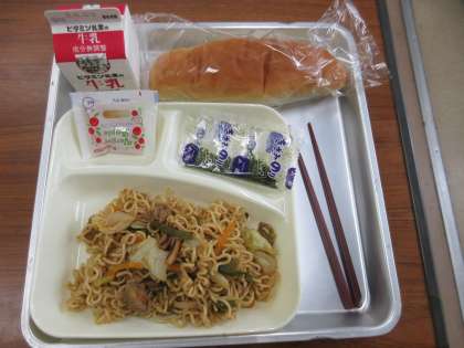 献立:焼きそば、パン、きざみのり、りんごジャム、牛乳 「ごちそうさまでした。」