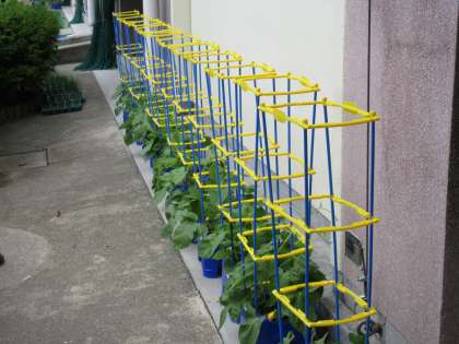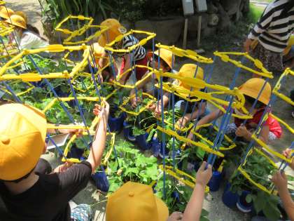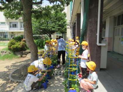 1年生が朝顔の観察をしています。大きな本葉が出てつるも伸びてきました。今日はみんなで支柱を立てました。
