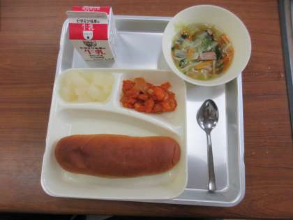 献立:えびのチリソース、中華スープ、和なし(カット缶)、パン、牛乳