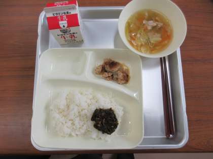 献立:豚肉のごまみそ焼き、すまし汁、のりのつくだ煮、ごはん、牛乳
