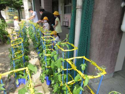 この土日の間に、1年生か育てているあさがおはどんどん伸びたようでした。