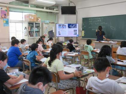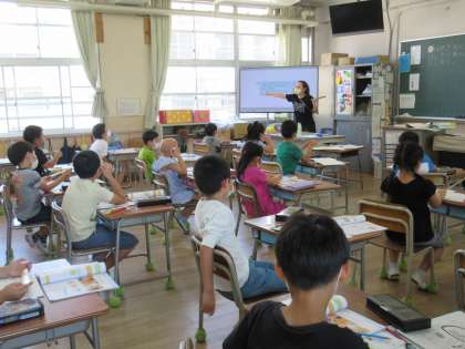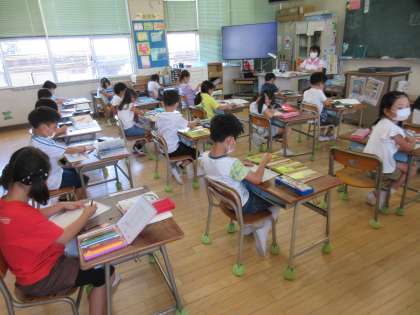 1年生は読んだ本の心に残った場面の絵をかいています。2年生は算数の長さの学習です。4年生は社会の学習をしています。