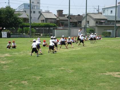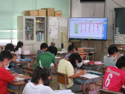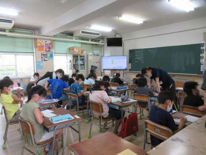 1年生は運動場で体育の授業をしています。今日は良い天気ですが空気は少しさわやかです。4年生は算数の「整理のしかた」の学習をしています。