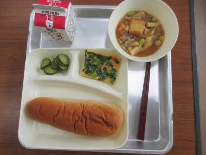 献立:豚肉と野菜の煮もの、チヂミ、きゅうりの甘酢あえ、パン、牛乳