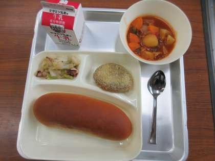 献立:チキンレバーカツ、ケチャップ煮、たことキャベツのバジルソテー、パン、牛乳