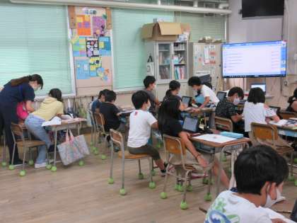 4年生はタブレットを使った調べ学習をしています。5年生はC-NETのクリストファー先生と藤井先生も一緒に学習する時間です。
