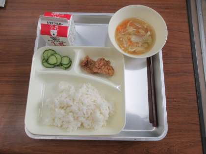 献立:豚肉の香味あげ、すまし汁、あっさりきゅうり、ごはん、牛乳