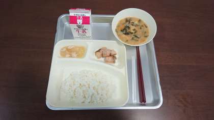 献立:さけのつけ焼き,みそ汁,とうがんの煮もの,ごはん,牛乳