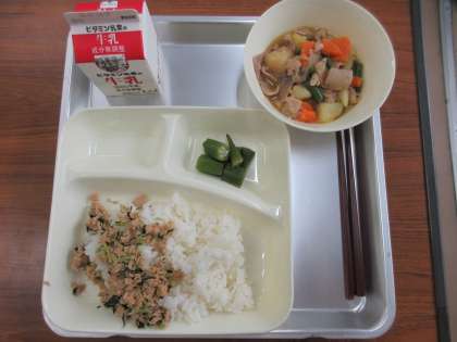 献立:豚肉とじゃがいもの煮もの、オクラの梅風味、ツナッ葉いため、ごはん、牛乳