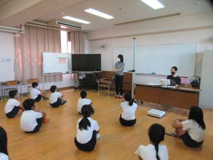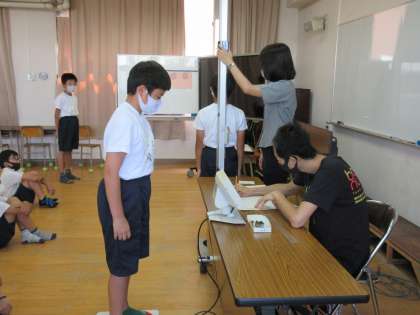 多目的室を使って密にならないようにすすめています。今回は身長と体重を測定しています。