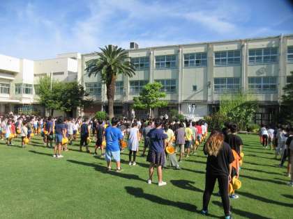運動場の芝生が青々と育っていて、とても気持ちいいですね。でも、芝を植えただけでは勝手に大きくはなりません。長かった1学期の間もみなさんのいない夏休みの間も、とても暑い中、管理作業員さんや先生方が水をやったり、肥料をまいたり、雑草を抜いたり、芝を刈ったりして、このようになったのです。みなさんの中には今年芝を植えてくれた人もあるかと思います。しっかりと根を張って芝が広がっていると思います。すばらしいことですね。お世話をしてくださってありがとうございます。この芝をみんなでこれからも大切にする気持ちを忘れないでほしいです。