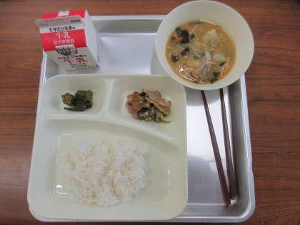 献立:豚肉の甘辛焼き、みそ汁、オクラのおかかいため、ごはん、牛乳