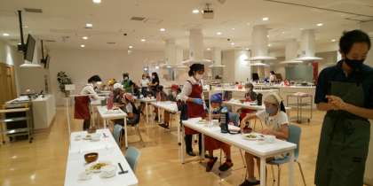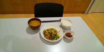 ごはんとみそ汁、野菜炒めが出来上がりました。とてもおいしそう。みんなで試食の時間です。
