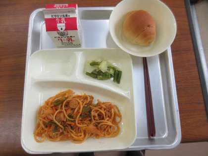 献立:イタリアンスパゲッティ、グリーンアスパラガスとキャベツのサラダ、パン、牛乳