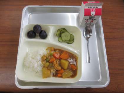献立:チキンカレーライス[米粉](ごはん)、きゅうりのピクルス、ぶどう(巨峰)、牛乳