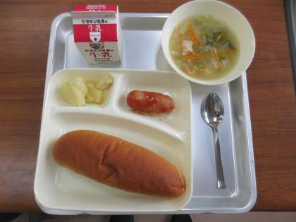 献立:フランクフルトのケチャップソース、スープ、焼きじゃが、パン、牛乳