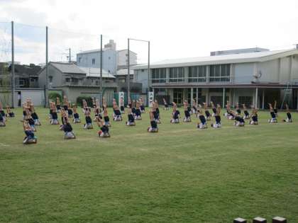 5・6年生の体育の学習の様子です。運動会の団体演技の練習をしています。