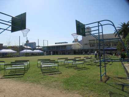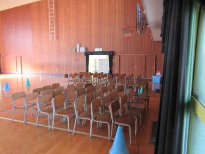 前もって児童の椅子を講堂に入れたり、長椅子を並べたりしています。今年は新型コロナウイルス感染症予防のため参観の保護者の方の席がもうすでに決まっています。長椅子を並べて番号をつけています。