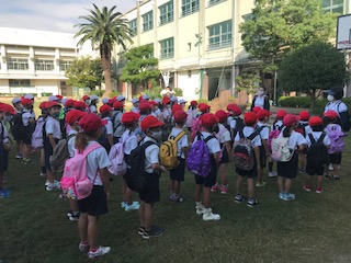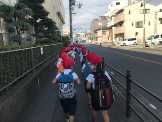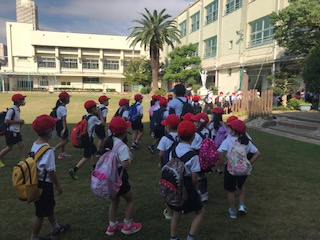 今日は1・2年生が長居公園まで遠足に出かけました。とてもよいお天気です。まずお話を聞いて出発しました。