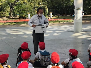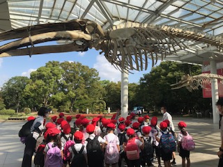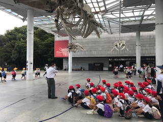 自然史博物館の前のクジラのところで前校長先生の西先生からお話をしていただきました。