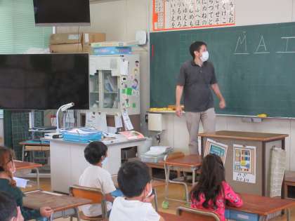 1・2年生と一緒にマット先生とアナ先生が外国語活動をしてくださいました。今日は先生たちが自己紹介してくれました。そのあと自分の名前を英語で言いました。