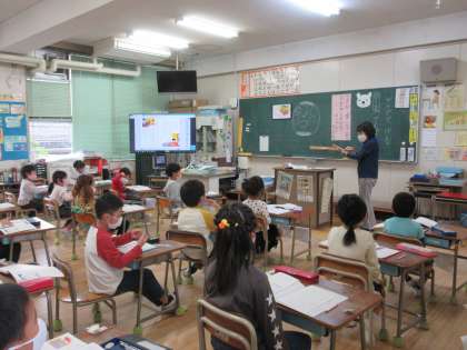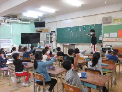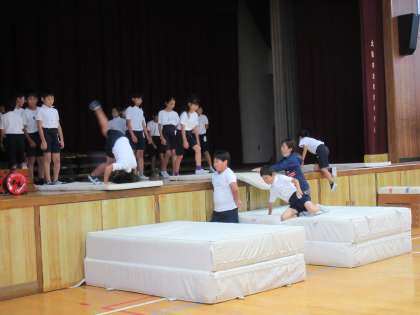 1年生の国語、4年生の体育の学習の様子です。4年生は「跳び箱」の動きの練習をしています。