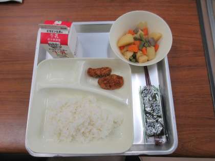 献立:みそカツ、じゃがいもと野菜の煮もの、焼きのり、ごはん、牛乳