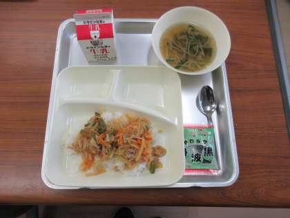 献立:ピリ辛丼(ごはん)、中華スープ、ソフト黒豆、牛乳
