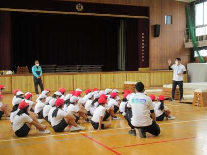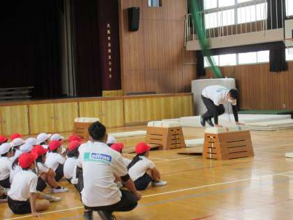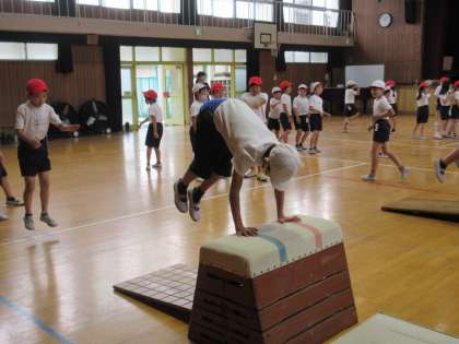 引き続き東成区子どもの体力向上事業で派遣される体育専門指導員に来ていただき、「跳び箱運動」の2日目です。今日は抱え込み跳びからスタートしました。2人の講師が実技を交えながら指導してくださいました。