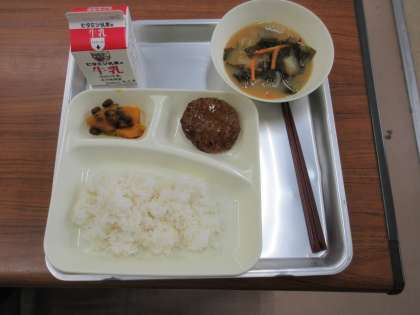献立:和風ハンバーグ、みそ汁、かぼちゃのいとこ煮、ごはん、牛乳
