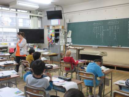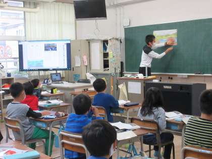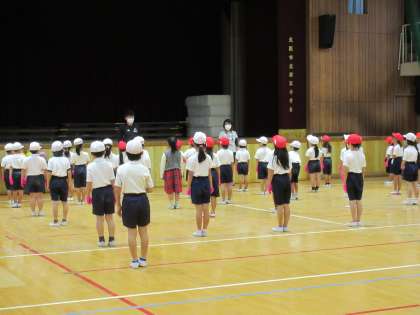 2年生の道徳と国語、1年生の体育の学習の様子です。1年生は基本の体操をするため前後をよく見て並ぶ練習をしています。