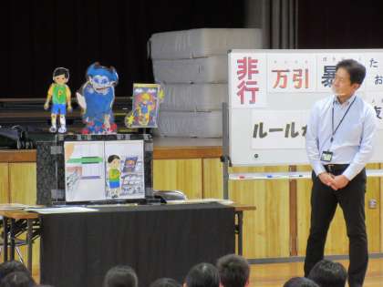 「非行」とはどういうことなのか、また、その中の「万引き」とはどこがいけないのかなどテープサートなどをつかっておしえていただきました。資料を持って帰りますのでおうちでも一緒に読んでいただければと思います。