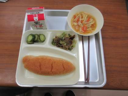 献立:牛肉のカレー風味焼き、ほたて貝とスープトマトのスパゲッティ、きゅうりのサラダ、パン、牛乳