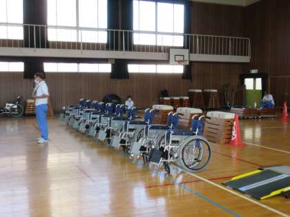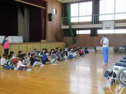 まず、講堂で車いすについてお話を聞きました。たくさん車いすを持ってきていただいています。