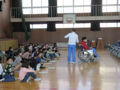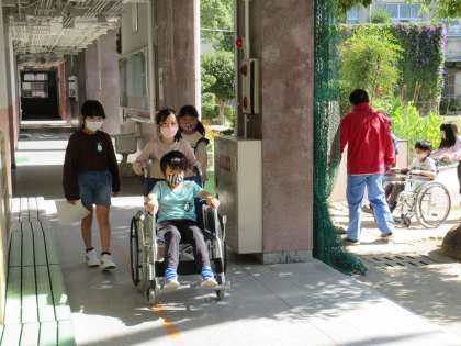 車いすの使い方を説明していただき、学校の中を車いすに友だちを乗せてグループで進みました。段差があるとなかなかうまく進まず、とても力がいることがわかりました。なかなか思うように進めないこともよくわかりました。