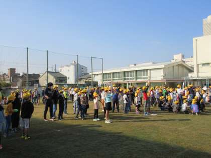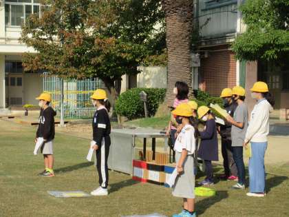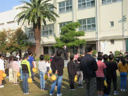 教頭先生と朝のあいさつをして、集会委員会が計画した「三択バースディクイズ」をしました。縦割り班に分かれて考えて答えています。